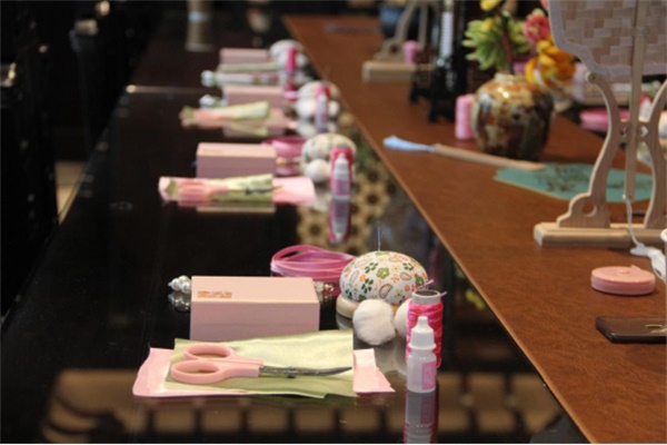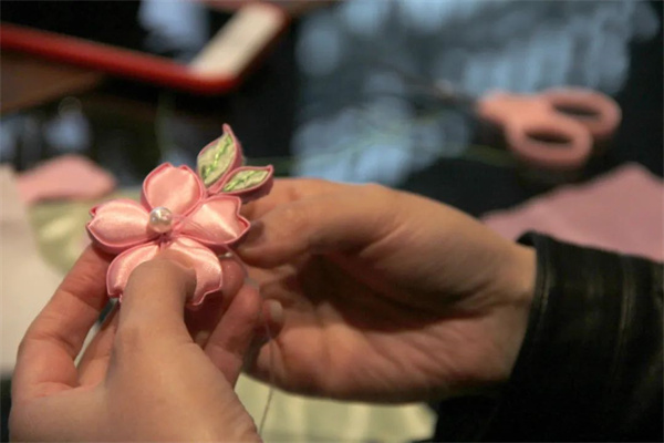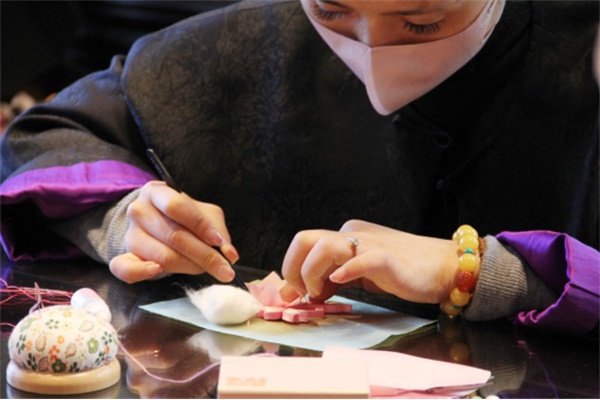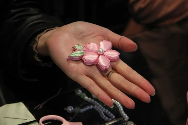 在老師的指導下,學員們紛紛動手制作,通過裁剪、縫制、纏繞等步驟,一朵朵精致的桃花盤扣逐漸在大家手中綻放成形。